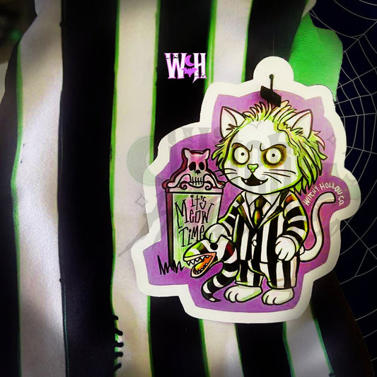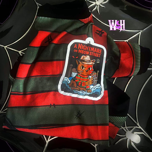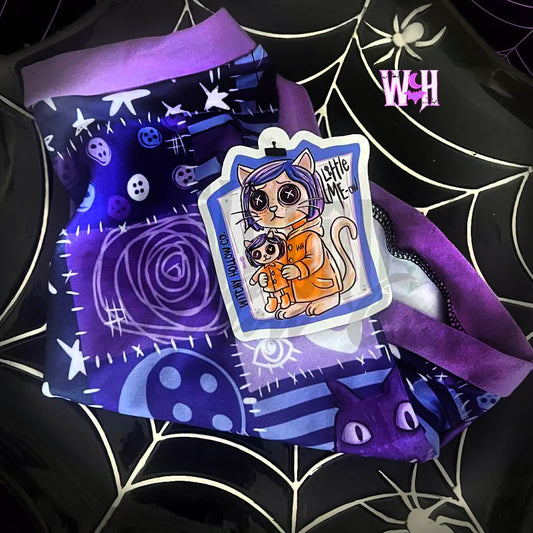"Summon the spooky season with this handmade cat shirt, crafted with hauntingly soft fabric and paired with a matching character cat sticker. Each design is inspired by our favorite ghouls, making it the perfect blend of creepy and cozy. Wear it if you dare… and let your familiar show off their true Halloween spirit."