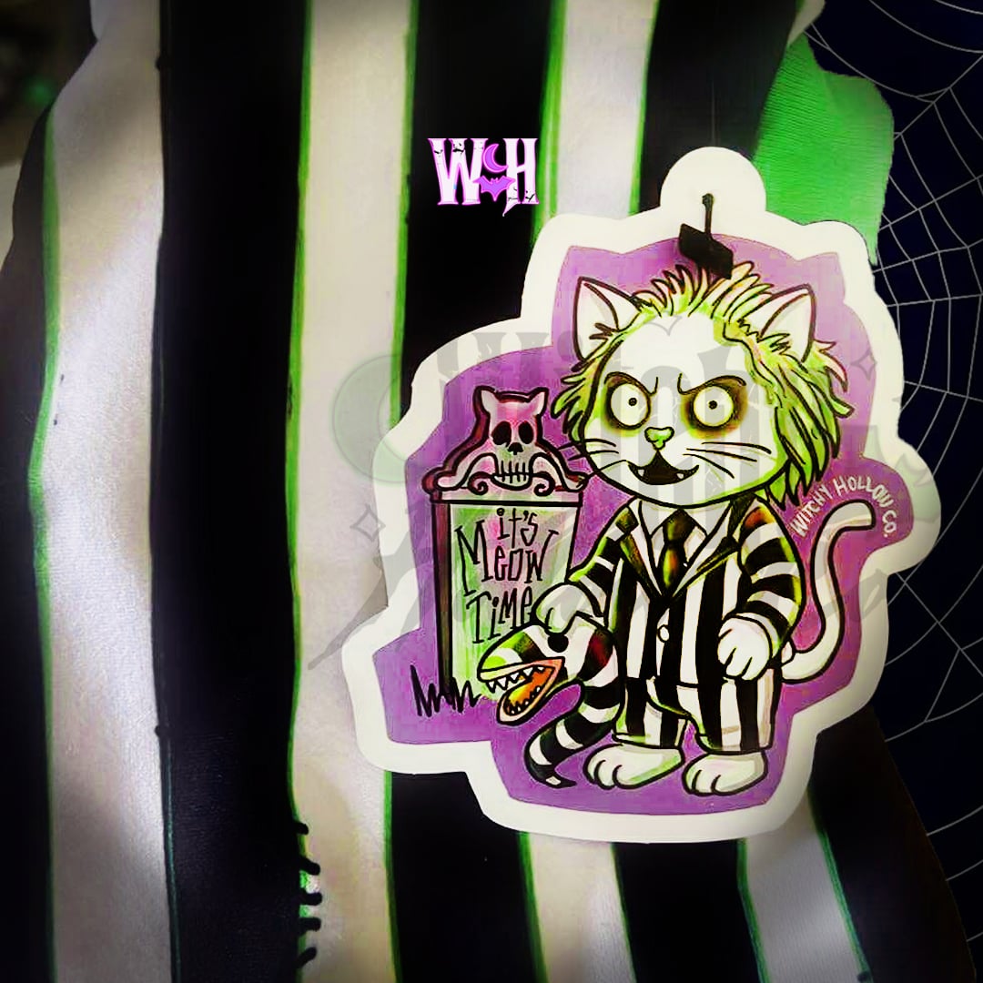 “Spooky, kooky, and a little gross—the Beetlejuice Cat is here to cause some afterlife mayhem. Handmade shirt with a mischievous striped kitty, plus a matching sticker so you can summon trouble three times over.”