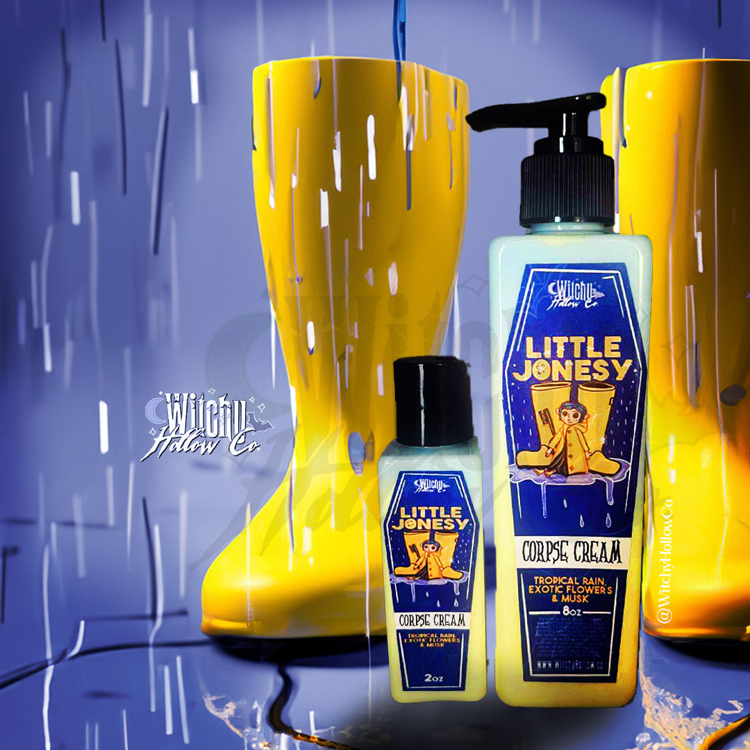 Our Little Jonesy Corpse Cream drenches your skin in silky hydration, scented with rain-soaked petals and musk. Smooth, supple, and just a little too perfect — like a button-eyed doll.